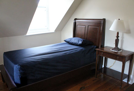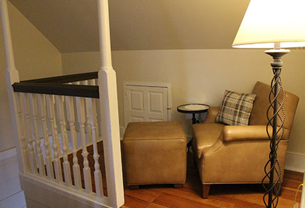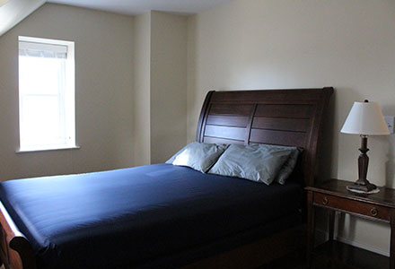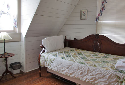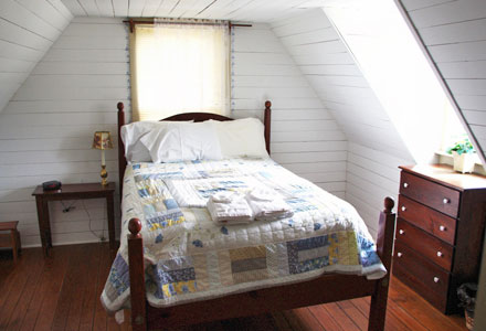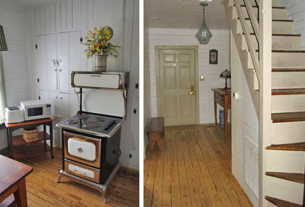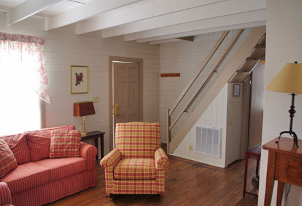 The front door enters into the living room. The bathroom and kitchen are also on the first floor. The stairs lead to the second floor where there are 2 bedrooms in what was once an open loft. One bedroom has a double bed. The other has a daybed with a trundle.
