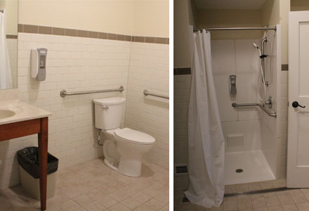 Downstairs is ADA-accessible and has a bedroom with a full-size mattress and bathroom. The living room has a full-size sleeper sofa.