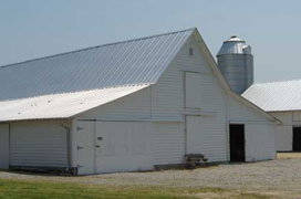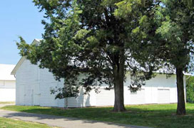 This one-story structure, built 1925-30, has a three-bay gable-end front and a ramp leading to central doors that slide open to admit a wagon or truck. Corn was loaded at the front of the building in an aisle flanked by two small wooden bins. The main corn storage bin occupied the majority of the building at the rear. Until recently, this bin was clearly visible from the exterior, being sheathed with wire mesh attached to narrow wooden slats. However, when the building was converted in the 1970s to an agricultural museum, the sides were covered with weatherboards.