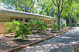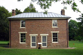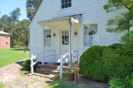 Began life as a turkey house on the farm lot southeast of the mansion. Together with the Garden House. it was moved to the edge of the yard in the late 1940s and remodeled into an office for Chippokes' proprietor, Victor Stewart. Later, in the 1950s, it served as the residence of the principal gardener. A modest one-story building consisting of two one-room-plan blocks, it was heavily remodeled in the 1980s and now serves as public toilets.