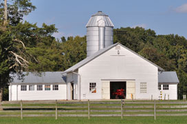 The dairy barn, built 1920-30, was still used as such in the 1960s. It consists of a two-level main block with a one-story rear unit set at right angles to it and forming, in plan, the head of a T. An early metal-sheathed silo stands at the rear of the building.